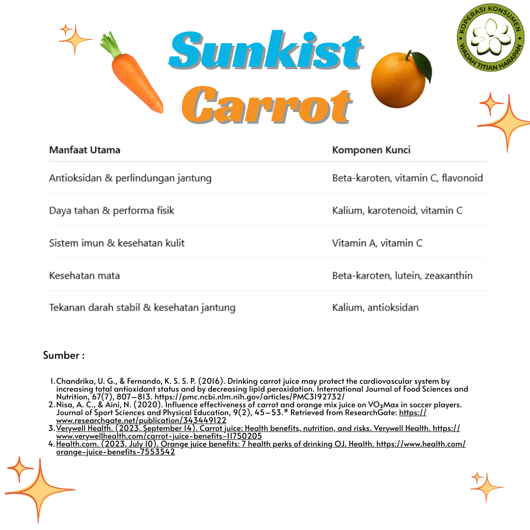 Nikmati perpaduan sempurna jeruk Sunkist yang kaya vitamin C dan wortel penuh beta-karoten.